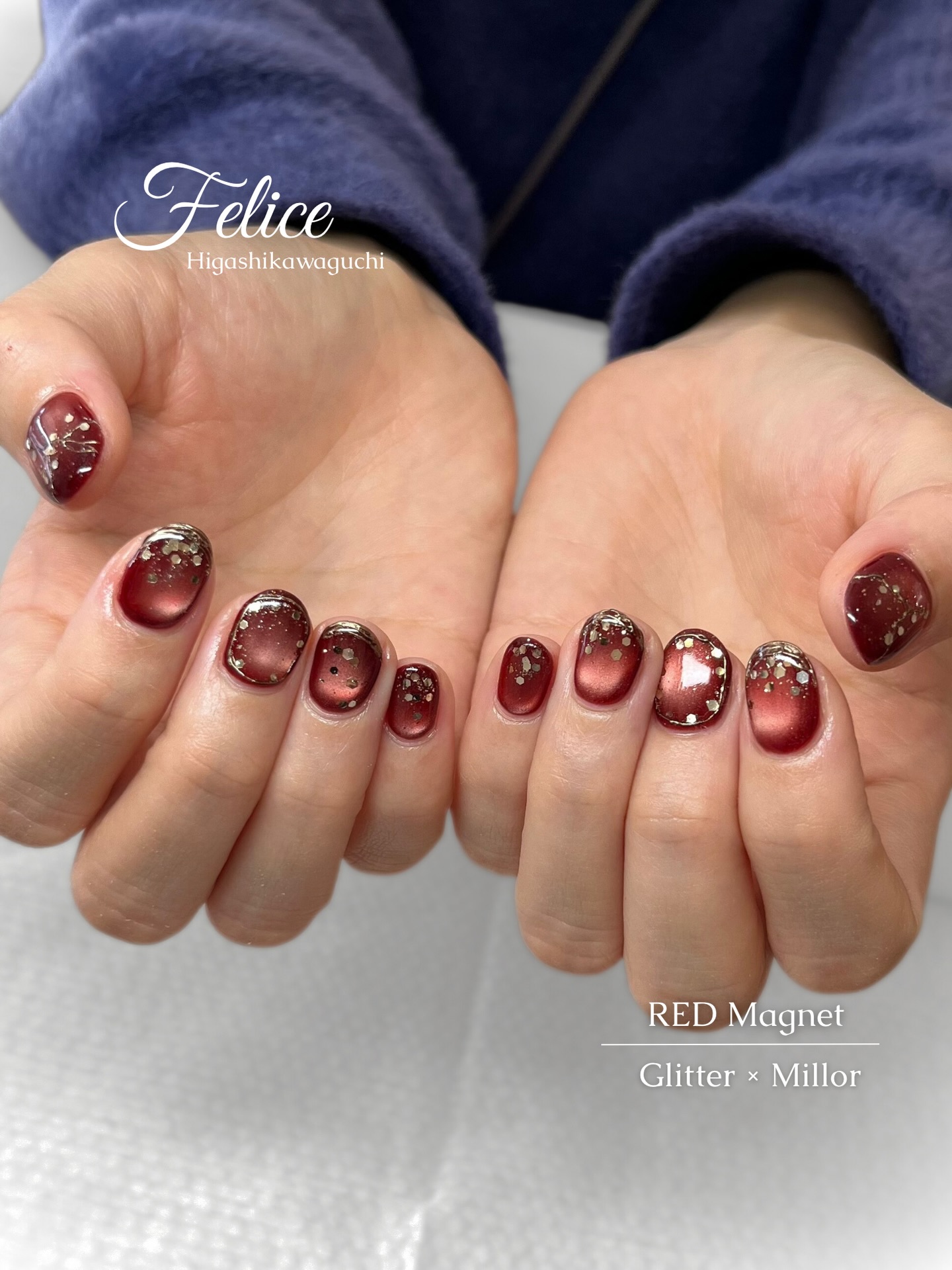 赤マグネットにミラーアートとラメをのせた定額デザイン