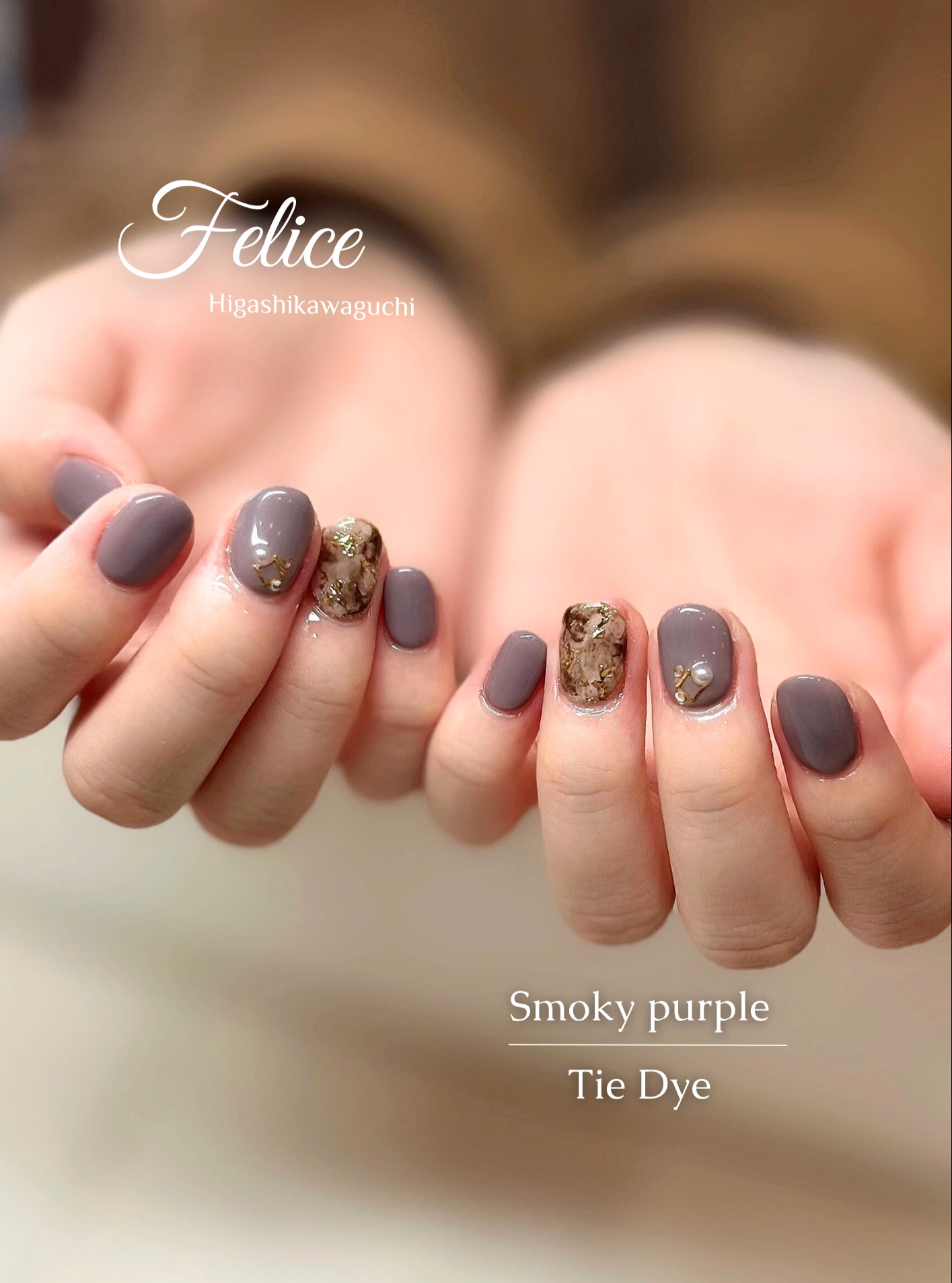 スモーキーパープルをメインカラーに使い、ポイントで秋冬オススメのタイダイ柄デザインを🤎