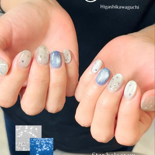 こんにちは♪ Felice東川口店のです! ・・・・・・・・・・・・・・・・・・・・・ お客様ネイルをご紹介 シルバーの星のホログラムが入ったマグネットデザイン︎ グレーベースのマグネットに一本ネイビ…