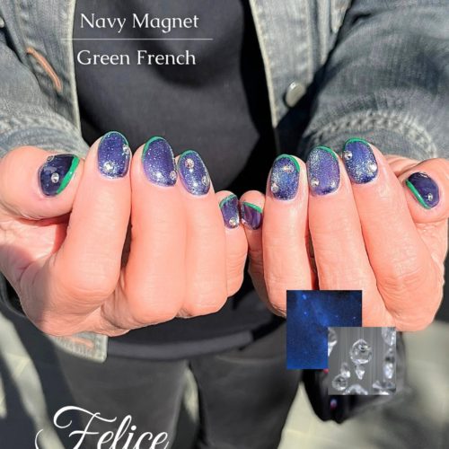 こんにちは♪ Felice東川口店のです! ・・・・・・・・・・・・・・・・・・・・・ お客様ネイルをご紹介 ネイビーのマグネットにクリスタルのストーンとグリーンの細フレンチを入れたおしゃれデザイン …